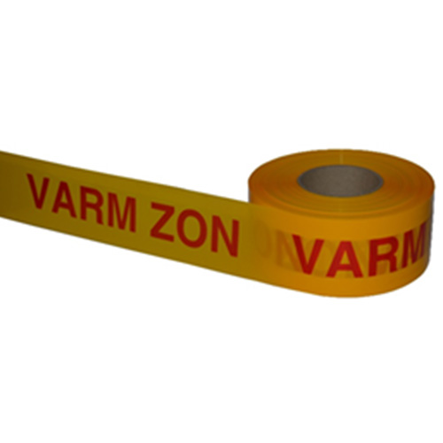 Avspärrningsband Varm Zon är av PE-film. Bandet är starkt, segt och har en hög draghållfasthet. Det är lätt att knyta fast vid t ex träd och stolpar samt tål kyla och trasslar inte.