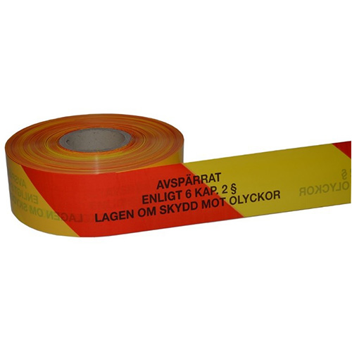 Avspärrningsband röd/gul är av PE-film. Bandet är starkt, segt och har en hög draghållfasthet. Det är lätt att knyta fast vid t ex träd och stolpar samt tål kyla och trasslar inte.