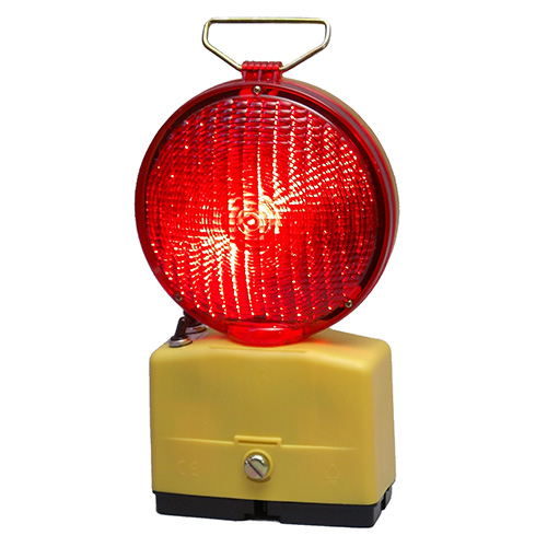 Varningslampa med switch för växling mellan fast och blinkande sken samt mellan rött och gult ljus. Den passar med Dafos trafikskyltar.