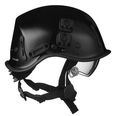 Hjälmskal i DuPont ™ Kevlar® och glasfiberförstärkt komposit. Storlek 52–65 cm och 4-punkts hakrem med lågprofilspänne.