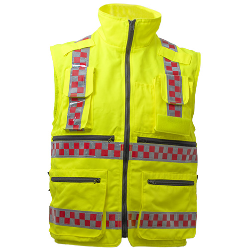 Befälsvästar med röd/silver-reflex, glidfoder på insidan och innerficka. Dubbla bröstfickor och monofonhållare samt fyra fickor med dragkedjor framtill.