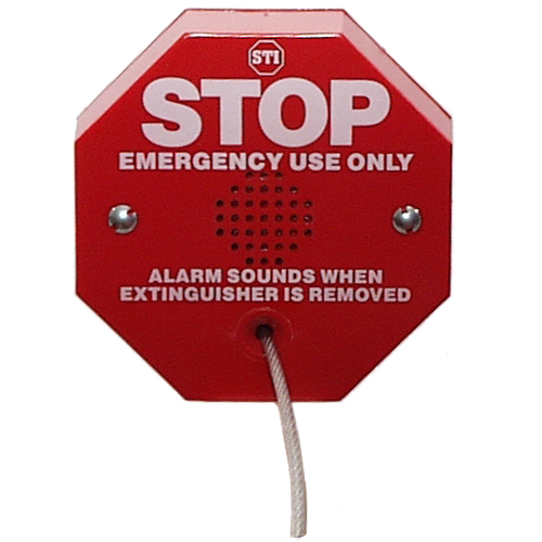 Brandsläckarlarm med vajer, 9 volt. Vajern fäst runt brandsläckaren och larmet monteras på vägg. När brandsläckaren tas från sin plats börjar larmet ljuda.