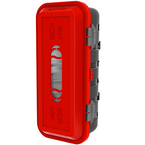 Skåpet finns i tre storlekar. Denna modell är avsedd för 6 kg pulversläckare. Det kan användas både utomhus och inomhus samt på fordon.