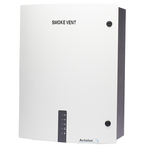 Strömförsörjning till rökluckor med 24V motordrift. För 8 st motortraverser. Inkl. batterier.