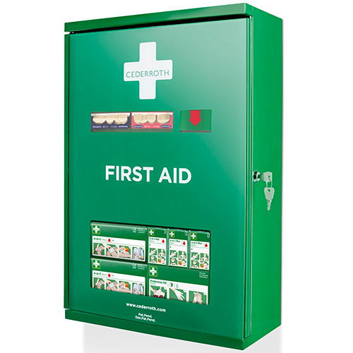 Första hjälpen-skåp stort, plåt, dubbla dörrar låsbart. Cederroth.