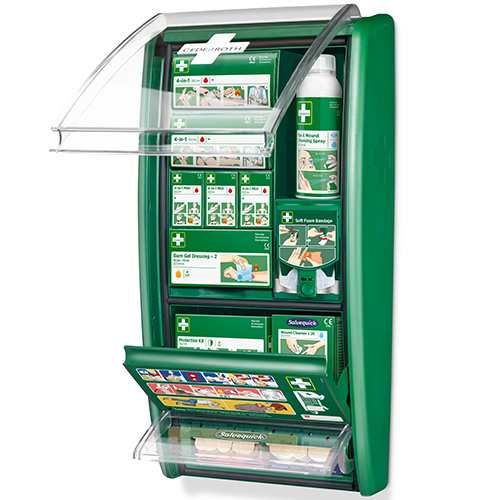 Första hjälpen station med transparenta luckor och sårvårdsmateriel för många olika typer av skador.