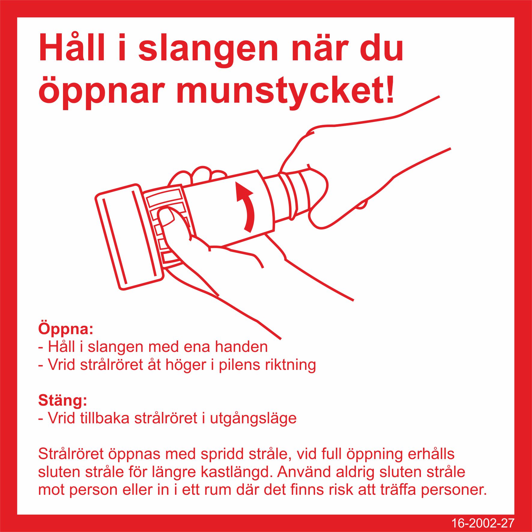 Dekal med instruktion för Handifighter, 150×150 mm. Instruktion hur strålrör Handifighter ska hanteras.