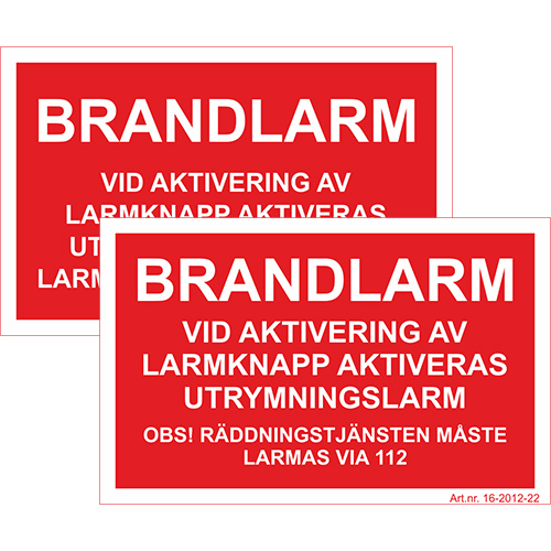 Skylt Tryckknapp utrymningslarm, 86×55 mm, dubbelsidig med olika text anpassad enligt SBF110:8
