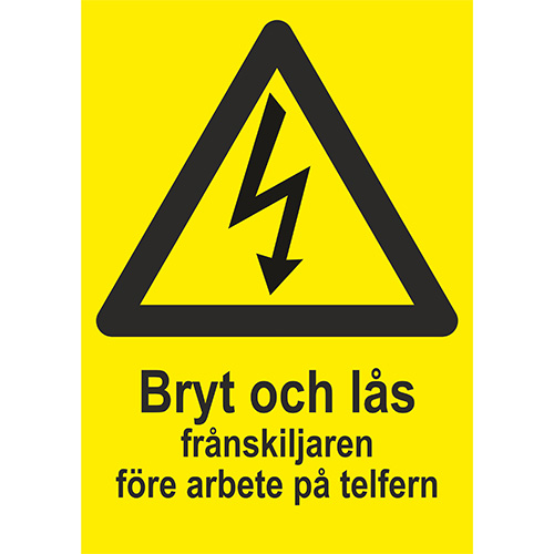 Skylt "Bryt och lås frånskiljaren före arbete på telfern" A4, 210 x 297 mm, plast